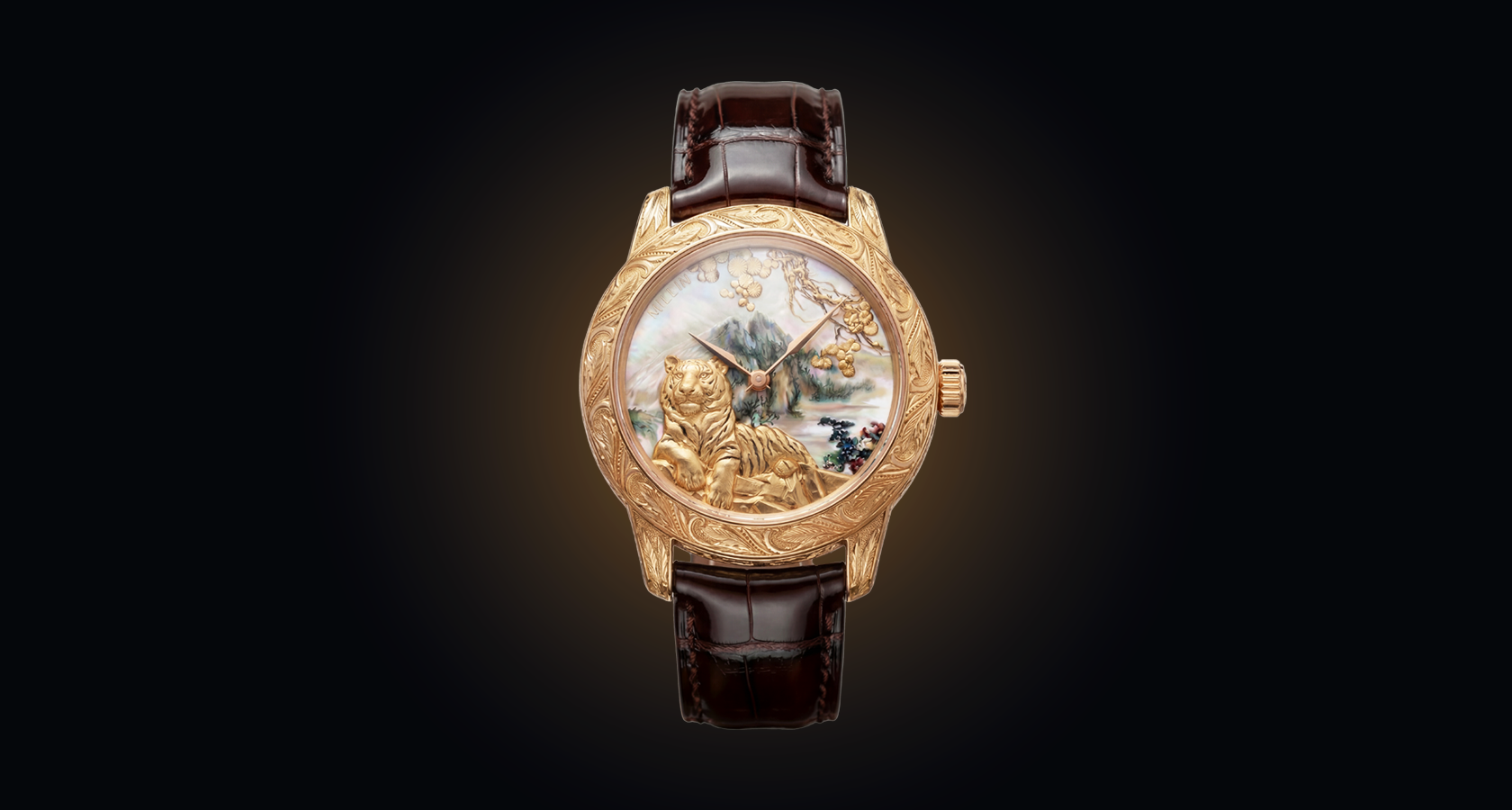 represents a symbiosis of handcraft techniques. The case of the watch features an embossed central figure of a tiger, hand-engraved, and the dial is covered with multiple layers of hot enameling.